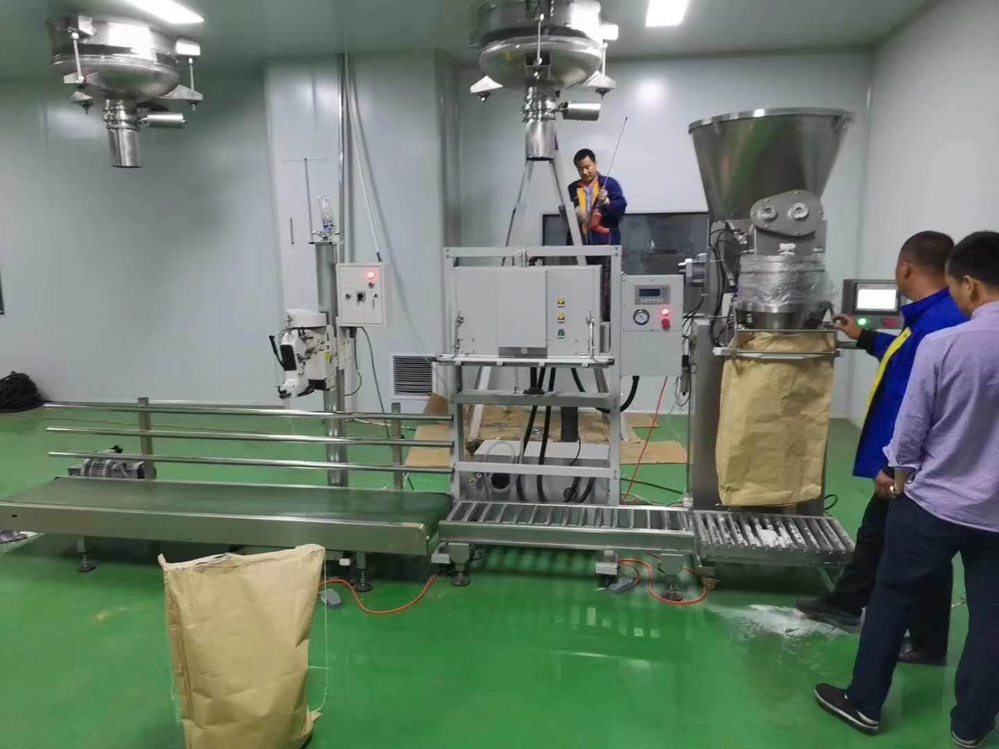 淀粉定量包裝秤是上海鑄衡廠家研發生產的一款智能控制包裝機械設備,主要由物料進口、給料機構(雙絞龍)、截料門、稱量斗、夾袋機構、機架、吸風口、電動系統、傳感器、控制箱、輸送和縫包機構等組成。該淀粉定量包裝秤具有結構合理,造型美觀,運行平穩,節能省電,操作方便的特點。